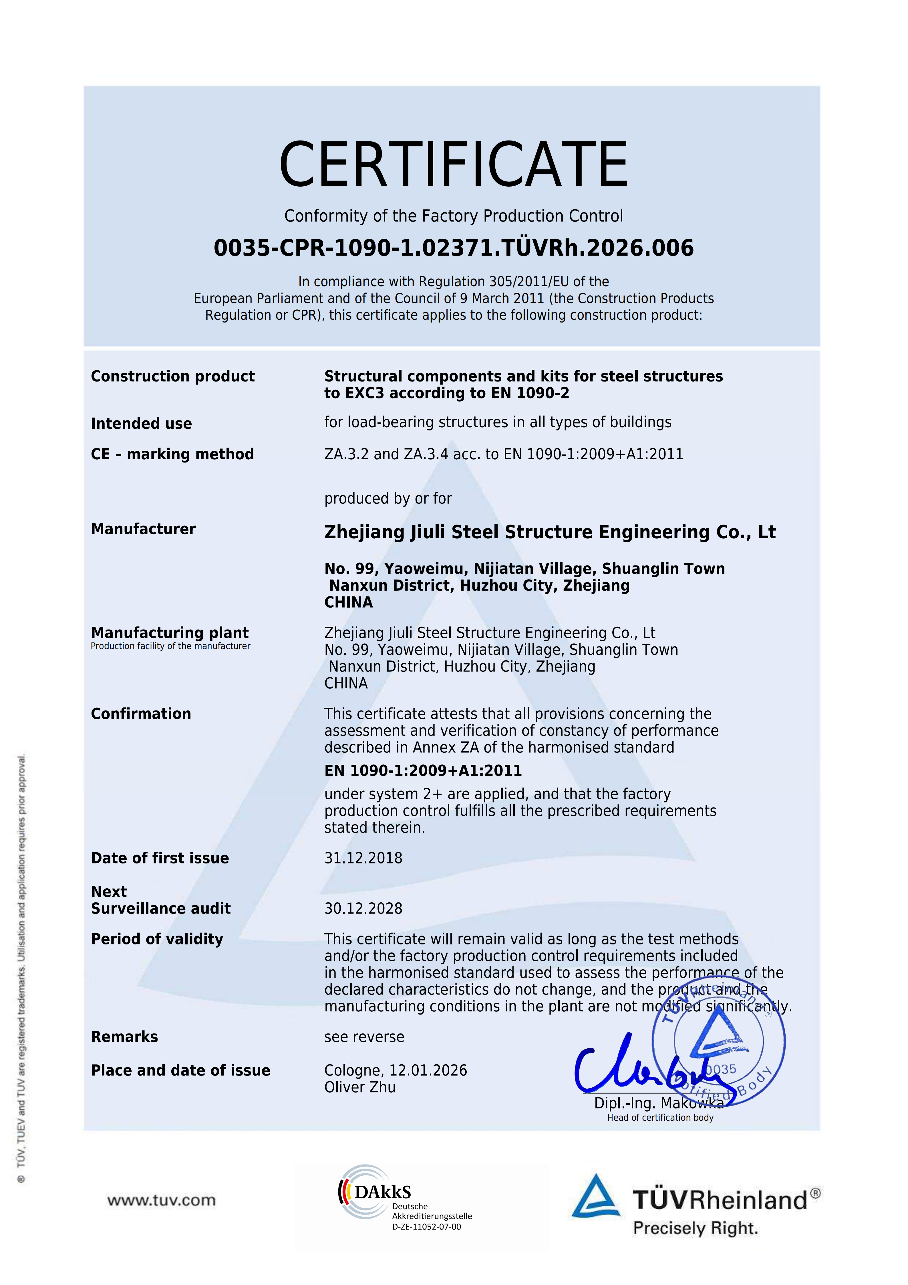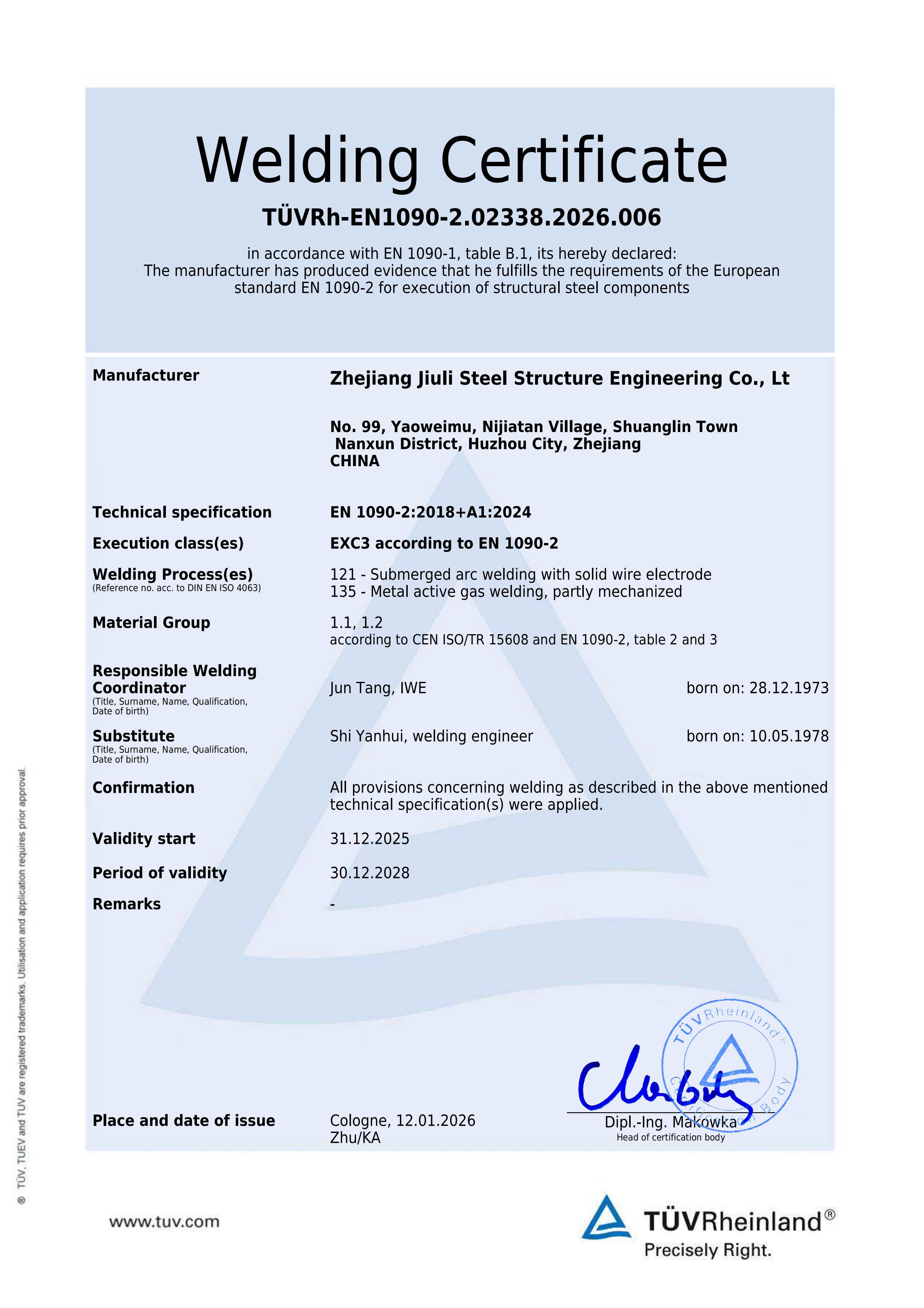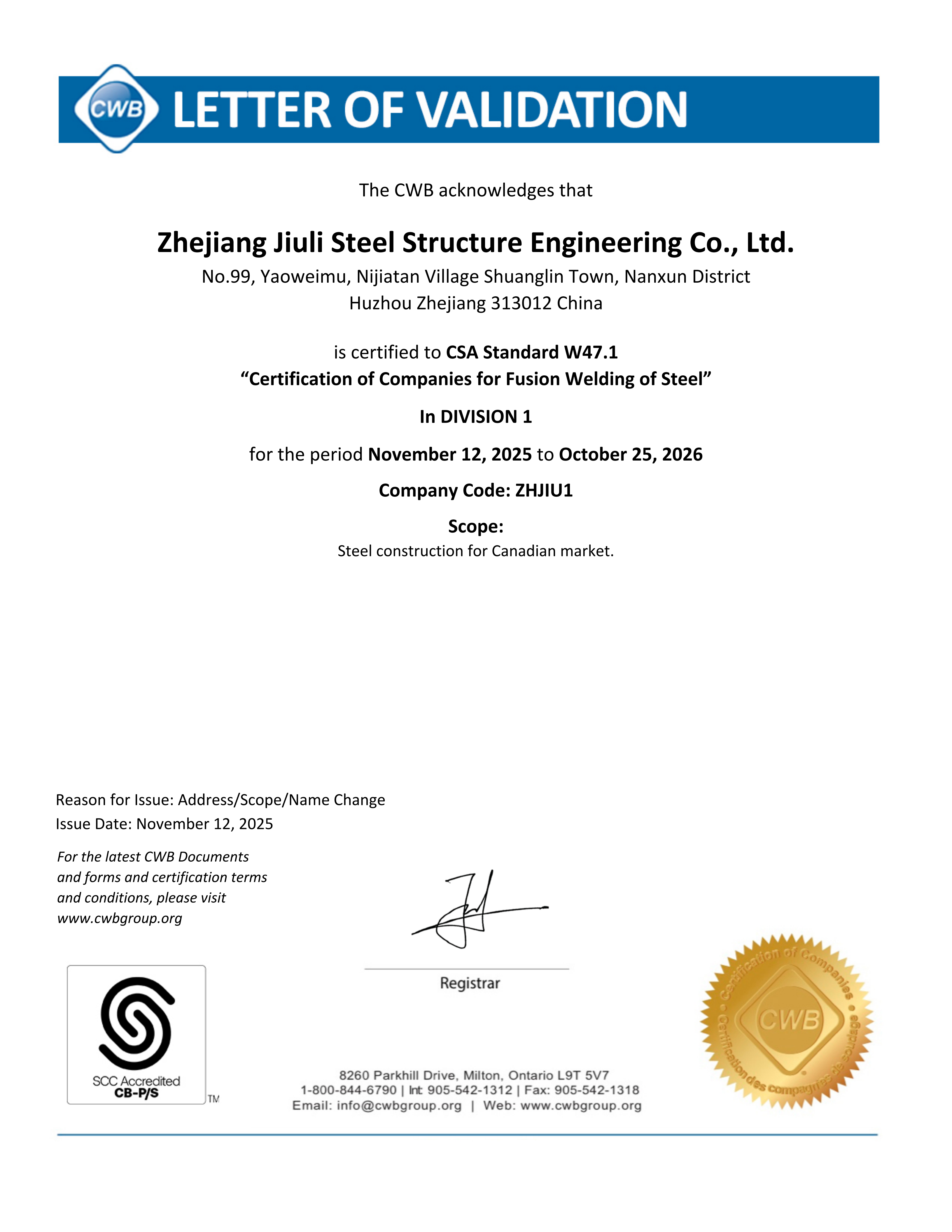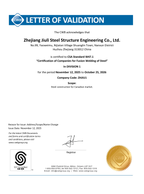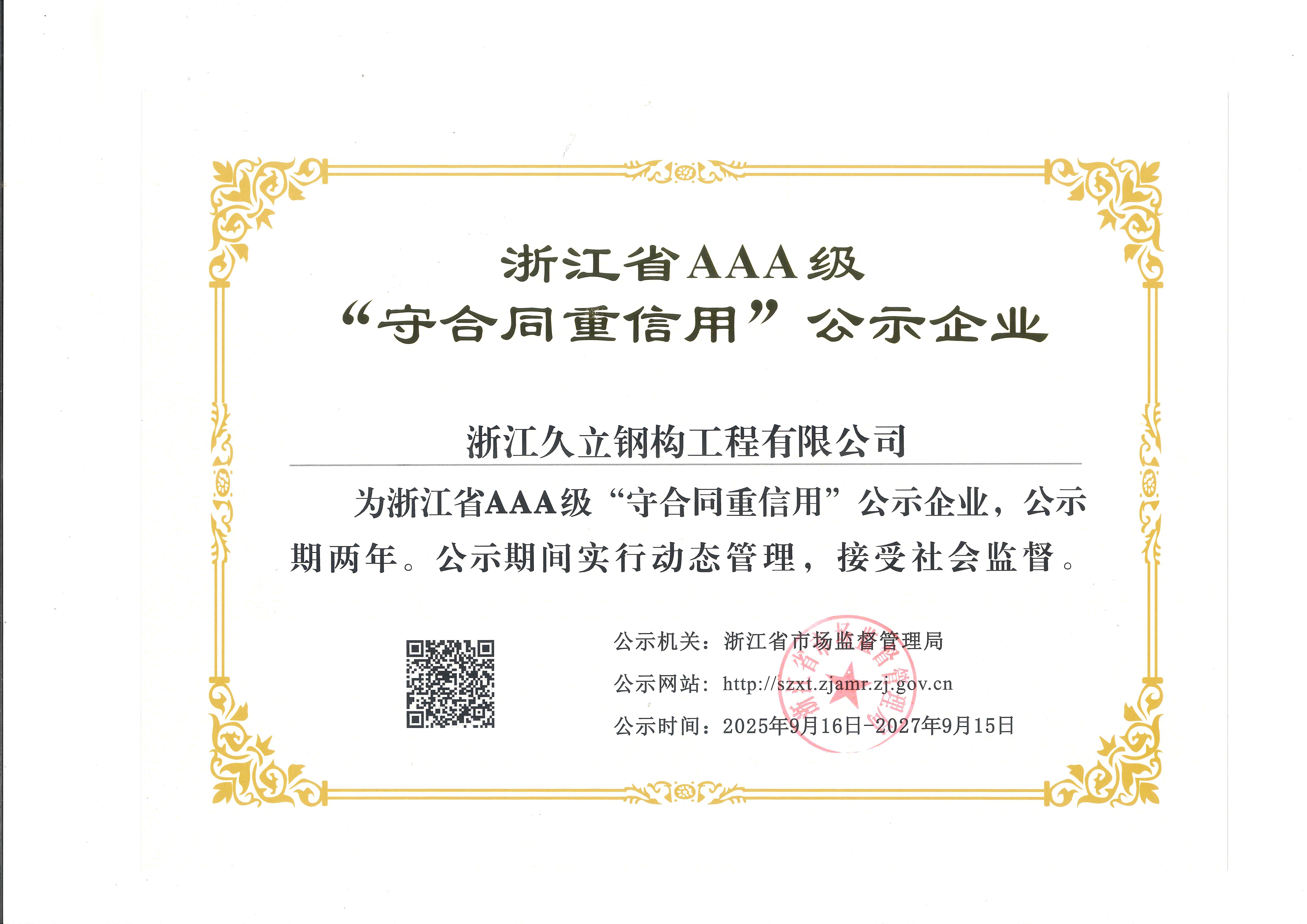 公司建有完善的质保体系,通过了IS09001:2015 质保体系的认证。拥有建设部颁发的建筑工程施工总承包贰级、钢结构专业承包壹级资质、制造特级资质。专业承接各类工业与民用工程的建设,钢结构的设计、制造和安装。公司立足国内市场,目前已在全国建立多个营销办事处,逐步形成了辐射全国的营销网络,并积极参与国际竞争,公司拥有加拿大焊接协会资格论证的加拿大 CWB 证书,加拿大A660-10证书,美标 AISC 证书,欧标EN1090和IS03834 证书,可承接来自欧美、澳洲等有特殊要求钢构件的出口加工,已成功地在非洲马达加斯加国及博茨瓦纳设立了分公司久立钢构是湖州地区率先进入国际市场的建筑企业之一。